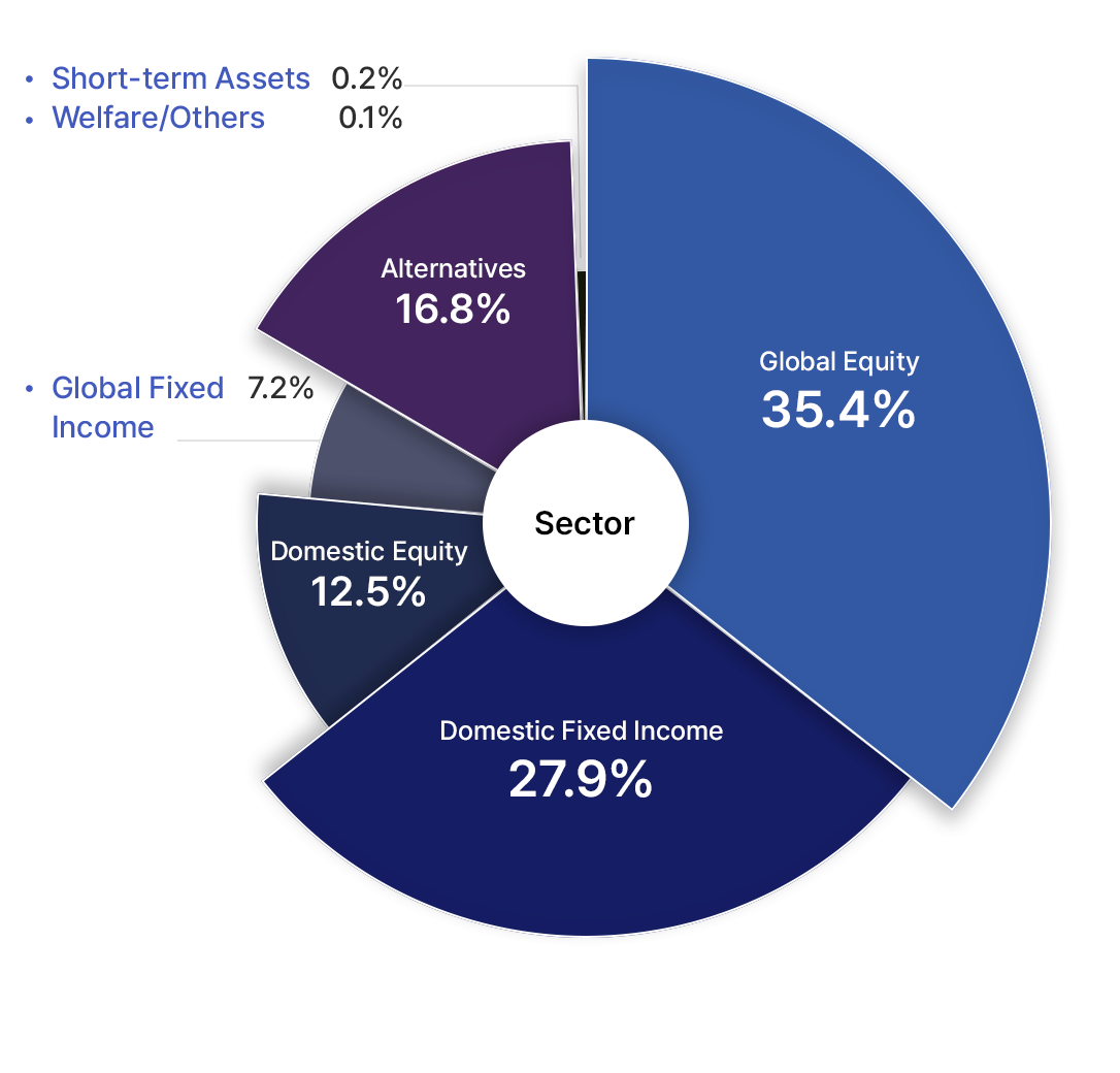 The National Pension Fund is managed in three areas(Financials, Welfare and Others) in line with the Guideline for National Pension Fund Management. Most of the Fund is invested in Financials such as equity, fixed income and alternative assets. NPS Investment Management seeks to diversify investment portfolios by decreasing the allocation to domestic fixed income and increasing exposure to overseas and alternative investments to deliver steady returns and hedge risks.